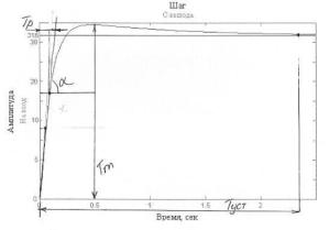 Оценку запаса устойчивости и быстродействия можно произвести по виду кривой переходного процесса в системе автоматического регулирования при некотором типовом входном воздействии. В качестве типового входного воздействия рассматривается обычно единичный скачок. В данном случае кривая переходного процесса для регулируемой величины будет представлять собой переходную характеристику системы (рисунок 12).