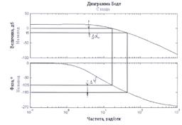 Анализируя полученные характеристики, видим, что точка ωср находится в области отрицательных значений, а запас устойчивости по амплитуде Lз =15 Дб удовлетворяет условию (6.18).