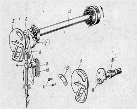 1 – игла; 2 – игловодитель; 3 – стягивающий винт; 4 – соединительная шпулька с хомутиком; 5 – нитеперетягиватель; 6 – палец; 7 – кривошип; 8 – шатун; 9 – сухарь; 10 – направляющая; 11 – два винта; 12 – накладка; 13 – главный вал.