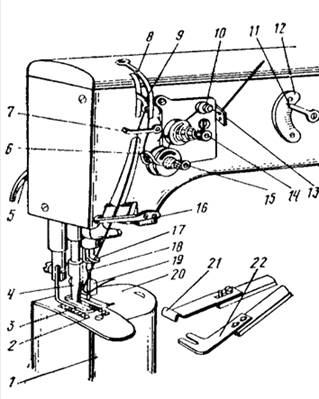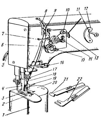 Нижнюю нитку направляют так же, как и в машине 852 кл. или 862 кл. (пластину 20 предварительно отодвигают вправо).