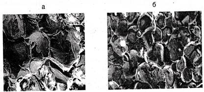 Рис. 4. Поверхности излома спечённых порошковых материалов (а) и образование межпластинчатого контакта в условиях жидкофазного спекания (б)