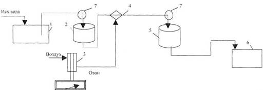 1.Емкость для исходной воды, 2. Фильтр механической очистки, 3.Озонатор, 4.Смеситель, 5.Сорбционные фильтры, 6.Емкость очищенной воды,7.Задвижки
