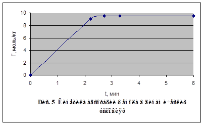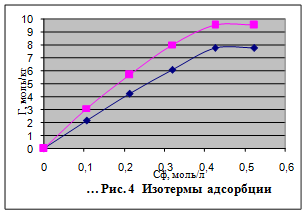 Органические токсиканты, к числу которых относится и диоксин (тетрахлордифенил), определяются как наиболее опасные загрязнители воды. В настоящее время не найдены или в достаточной степени не исследованы методы очистки воды от диоксина и подобных ему веществ. Однако существует возможность по результатам исследований одного токсиканта рассчитать адсорбционные характеристики других, и таким образом, предложить метод очистки воды от любых органических токсикантов, в том числе и от наиболее опасных. В качестве объекта исследования был взят фенол. Среди многих методов очистки воды от фенола наиболее эффективным является метод адсорбции активированным углем. На рис.4 изображены изотермы адсорбции фенола активированным углем марки АГ-3. По изотерме адсорбции можно определить максимальную (предельную) адсорбцию в статических условиях Гпр =7,97 моль/кг и в динамических условиях Гпр =9,55 моль/кг. Динамические условия создаются в реакторе с кипящим слоем АУ при избытке адсорбента (Кизб =10).