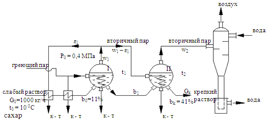 Первый корпус обогревается свежим водяным паром. Вторичный пар, образующийся при концентрировании раствора в первом корпусе, направляется в качестве греющего во второй корпус. Сюда же поступает частично сконцентрированный раствор из 1-го корпуса.