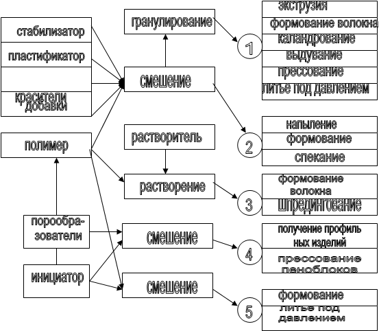 Изделия из расплавов или растворов термопластичных полимеров изготавливают экструзией (непрерывное выдавливание расплава), литье под давлением (заполнение расплавом полости формы), выдуванием (для пустотелых изделий), спеканием, напылением и т.д.