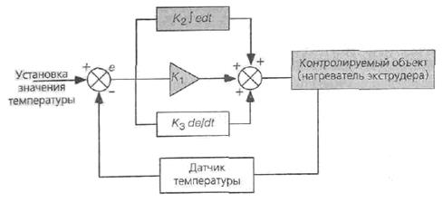 Дополнительный контур управления выдает сигнал, пропорциональный производной температуры экструдера по времени, то есть скорости изменения температуры экструдера. Выходной сигнал PID-регулятора описывается следующим уравнением: