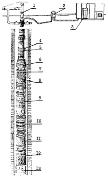 Струйный насос (рис. 13) приводится в действие под влиянием напора рабочей жидкости (лучше нефти или воды), нагнетаемой в НКТ 1, соединенные с соплом 2. При прохождении узкого сечения сопла струя перед диффузором 4 приобретает большую скорость и поэтому в каналах 3 снижается давление. Эти каналы соединены через полость насоса 5 с подпакерным пространством 6 и пластом, откуда пластовая жидкость всасывается в насос и смешивается в камере смешения с рабочей. Смесь жидкостей далее движется по кольцевому пространству насоса и поднимается на поверхность по межтрубному пространству (насос спускают на двух концентрических рядах труб) под давлением нагнетаемой в НКТ рабочей жидкости. Насос может откачивать высоковязкие жидкости и эксплуатироваться в сложнейших условиях (высокие температуры пластовой жидкости, содержание значительного количества свободного газа и песка в продукции и т.д.).По данным НИПИ Гипроморнефтегаз срок службы струйного насоса в абразивной среде не менее 8 мес., теоретический отбор жидкости до 4000 м3 /сут. максимальная глубина спуска - 5000 м, масса погружного насоса 10 кг.В 1971 г. Крецом В.Г. были обоснованы и предложены схемы струйных установок для целей испытания, освоения и эксплуатации нефтяных скважин (НИИ ВН при ТПУ). Тогда внедрены были струйные установки для откачки питьевой воды из скважин (разработанные под руководством В.С. Арбит и С.Я. Рябчикова).