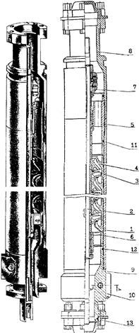 Модуль-секция насоса (рис. 4) состоит из корпуса 1, вала 2, пакетов ступеней (рабочих колес - 3 и направляющих аппаратов - 4), верхнего подшипника 5, нижнего подшипника 6, верхней осевой опоры 7, головки 8, основания 9, двух ребер 10 (служат для защиты кабеля от механических повреждений) и резиновых колец 11, 12, 13. Рабочие колеса свободно передвигаются по валу в осевом направлении и ограничены в перемещении нижних, и верхним направляющими аппаратами. Осевое усилие от рабочего колеса передается на нижнее текстолитовое кольцо и затем на бурт направляющего аппарата. Частично осевое усилие передается валу вследствие трения колеса о вал или прихвата колеса к валу при отложении солей в зазоре или коррозии металлов. Крутящий момент передается от вала к колесам латунной (Л62) шпонкой, входящей в паз рабочего колеса. Шпонка расположена по всей длине сборки колес и состоит из отрезков длиною 400-1000 мм. Направляющие аппараты сочленяются между собой по периферийным частям, в нижней части корпуса они все опираются на нижний подшипник 6 и основание 9, а сверху через корпус верхнего подшипника зажаты в корпусе. Рабочие колеса и направляющие аппараты насосов обычного исполнения изготавливаются из модифицированного серого чугуна и радиационно модифицированного полиамида, насосов коррозионно-стойкого исполнения - из модифицированного чугуна ЦН16Д71ХШ типа "нирезист". Валы модулей секций и входных модулей для насосов обычного исполнения изготавливаются из комбинированной коррозионно-стойкой высокопрочной стали ОЗХ14Н7В и имеют на торце маркировку "НЖ" для насосов повышенной коррозионной стойкости - из калиброванных прутков из сплава Н65Д29ЮТ-ИШ-К-монель и имеют на торцах маркировку "М".