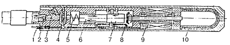 Рис. 9. Погружной диафрагменный электронасос:1 – токоввод; 2 – нагнетательный клапан; 3 – всасывающий клапан; 4 – диафрагма; 5 – пружина; 6 – плунжерный насос; 7 – эксцентриковый привод; 8 – конический редуктор; 9 – электродвигатель; 10 - компенсатор