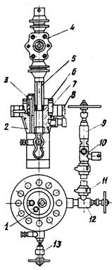 Рис. 10. Устьевая арматура типа АУЭ: 1 - перепускной клапан; 2 - манжета; 3 - уплотнение кабеля; 4 ‑ пробковый кран; 5 ‑ патрубок; 6 - зажимная гайка; 7 ‑ трубная подвеска; 8 - корпус; 9,12,13 - угловые вентили; 10 ‑ отборник проб, 11 - быстросъемное соединение