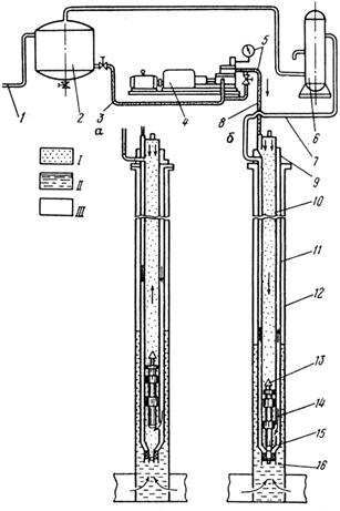Рис. 11. Схема компоновки оборудования гидропоршневой насосной установки:а – подъем насоса; б – работа насоса; 1 – трубопровод; 2 – емкость для рабочей жидкости; 3 – всасывающий трубопровод; 4 – силовой насос; 5 – манометр; 6 – сепаратор; 7 – выкидная линия; 8 – напорный трубоопровод; 9 – оборудование устья скважины; 10 – 63 мм трубы; 11 – 102 мм трубы; 12 – обсадная колонна; 13 – гидропоршневой насос (сбрасываемый); 14 – седло гидропоршневого насоса; 15 – конус посадочный; 16 – обратный клапан; I - рабочая жидкость; II - добываемая жидкость; III - смесь отработанной и добытой жидкости