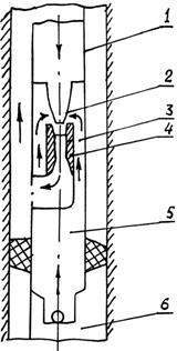 Рис. 13. Схема струйного насоса:1 - насосно-компрессорные трубы; 2 - сопло; 3 ‑ каналы; 4 ‑ диффузор; 5 - входная часть насоса; 6 ‑ подпакерное пространство