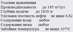 Установки обеспечивают подачу от 16 до 200 м3 /сут, давление 9¸12МПа; КПД погружного агрегата составляет 38¸50%; мощность электродвигателя 5,5, 22 и 32 кВт; масса погружного агрегата 341¸713 кг; частота вращения - 1500 мин-1 .