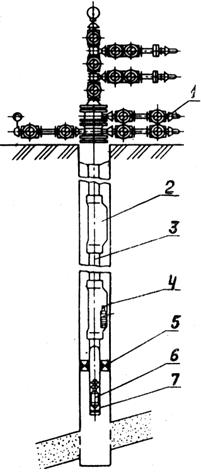 1 – фонтанная арматура; 2 – скважинная камера; 3 ‑ колонна насосно‑компрессорных труб; 4 – газлифтный клапан; 5 – пакер; 6 – приемный клапан; 7 – ниппель приемного клапана