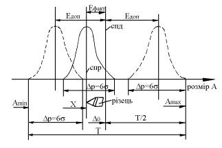 значно перевищує поле допуску Т = 0,1 мм, тому при обробці всієї партії заготовок без підналагодження верстата брак є технічно неминучим (рис. 4, а).