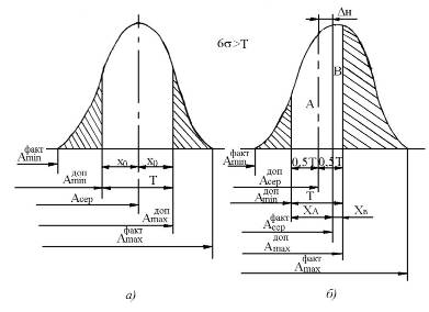 Наприклад, при обробці валиків з допуском Т = 0,1 мм при σ = 0,025 мм і 6σ=0,15 мм, тобто у випадку, коли поле розсіювання у 1,5 раза перевищує поле допуску і запас точності