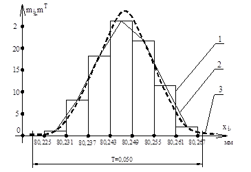 При цьому очевидно, що площа, яка обмежена кривою нормального розподілу і віссю абсцис (рис. 2), дорівнює одиниці і визначає 100 % заготовок партії. Площа заштрихованих ділянок представляє собою кількість (в частках одиниці або у відсотках) заготовок, що виходять своїми розмірами за межі допуску.