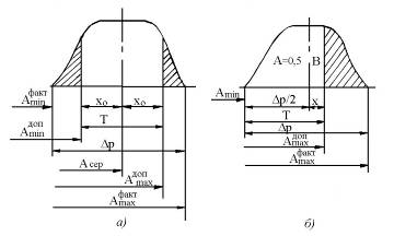 Практика показує, що при симетричному розташуванні кривої розподілу розмірів оброблюваних заготовок, кількість бракованих заготовок, що характеризуються площею заштрихованих ділянок, порівняно невелика (рис. 2).
