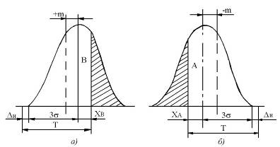 В цьому випадку необхідно при обробці валів вершину кривої розподілу змістити на деяку величину m вправо від середини поля допуску (рис. 6, а), щоб всі вали, що виходять за межі допуску, мали розмір більший за визначений за кресленням і після додаткової операції шліфування могли стати придатними. Аналогічно цьому отвори, що виходять за межі допуску, повинні мати діаметр менший за мінімальний, для чого при настроюванні верстата криву розподілу розмірів отвору потрібно змістити на величину mвліво по відношенню до середини поля допуску (рис. 6, б).