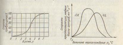 Рис.2 Скорость роста кристаллов и скорость зарождения центров кристаллизации в зависимости от степени переохлаждения.