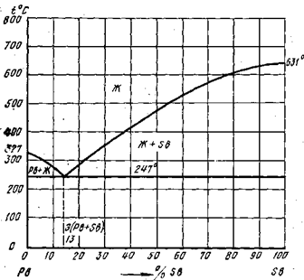 Линия АСВ является линией ликвидус (начало кристаллизации), линия D СЕ линией солидус (конец кристаллизяции). На линии АС начинают ( при охлаждении) выделяться кристаллы свинца, а на линии СВ — кристаллы олова. На линии D СЕ из жидкости концентрации 13% одновременно выделяются кристаллы свинца и олова.