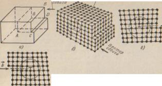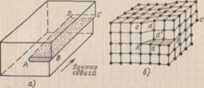Наиболее простои и наглядный способ образования дислокаций в кристалле— сдвиг (рис. 1, а) Если верхнюю часть кристалла сдвинуть относительно нижней на одно межатомное расстояние, причем зафиксировать положение, при котором сдвиг охватывает не всю плоскость скольжения, а только часть ее АВС D , то граница АВ между участком, где скольжение уже произошло, и не нарушенным участком в плоскости скольжения и будет дислокацией (рис. 1, а).