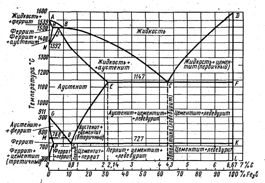 Так как железо, кроме того, что образует с углеродом химическое соединение Fe3 С, имеет две аллотропические формы α и γ то в системе существуют следующие фазы: