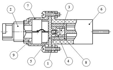 Магнитная система датчика образована магнитом 3, двумя концентраторами 4, которые крепятся на якорь 8, вся магнитная система функционирует по линейной траектории внутри основания 6. На крышке 5 крепиться магнитодиод 1. Согласующая часть 7 служит для соединения разъема датчика 2, который фиксируется гайкой 9 с измерительной системой. Внутри основания при измерениях перемещается якорь, общая длина которого равна сумме длин на крепление, перемещение, и фиксирование концентраторов и магнита. Также на якоре предусмотрена система защиты от механического воздействия магнитной системы на магнитодиод. Части конструкции соединяются винтами и гайкой М2 Гост 4351-67.