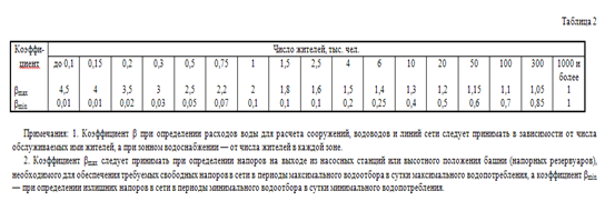где α – коэффициент, учитывающий степень благоустройства зданий, режим работы предприятий и другие местные условия, принимаемый αmax =1,2–1,4; αmin =0,4–0,6; βmin , βmax – коэффициенты, учитывающие число жителей в населенном пункте и принимаются по таблице: