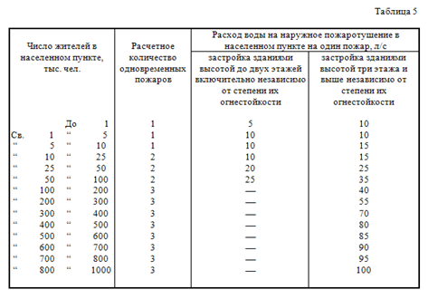 где Qп – расход воды на наружное пожаротушение (л/с), определяемый в соответствии с нижеприведенной таблицей в зависимости от количества жителей в населенном пункте и типа зданий (предполагаем застройку населенного пункта зданиями высотой три этажа и выше).