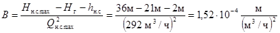 Зная из предыдущих расчетов значение подачи насосной станции при максимальном водопотреблении (Qн.с.max , = 292 м3 /ч), значение требуемого напора при максимальном водопотреблении (Hн.с = 36 м) и геометрический напор (Hг = 21 м), можно определить гидравлическое сопротивление водопроводной сети: