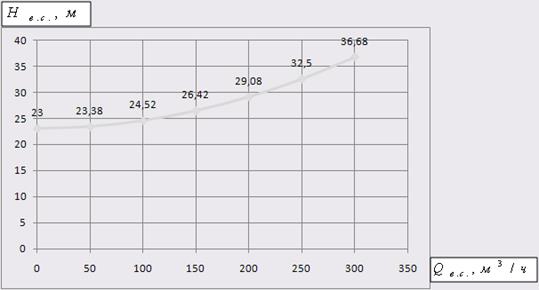 Зная гидравлическое сопротивление В, рассчитываем характеристику водопроводной сети. Расчет характеристики водопроводной сети Hв.с = f(Q) удобно вести в табличной форме. Причем значения расходов Q должны охватывать весь диапазон подач насосной станции от Qн.с.min = 22,7 м3 /ч до Qн.с.max = 424 м3 /ч.