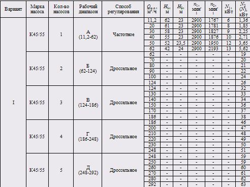 Предварительно подбираются несколько вариантов насосов для обеспечения подач в диапазоне от Qн.с.min до Qн.с.max и, соответственно, напоров от Hн.с.min до Hн.с.max .