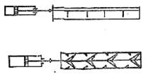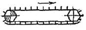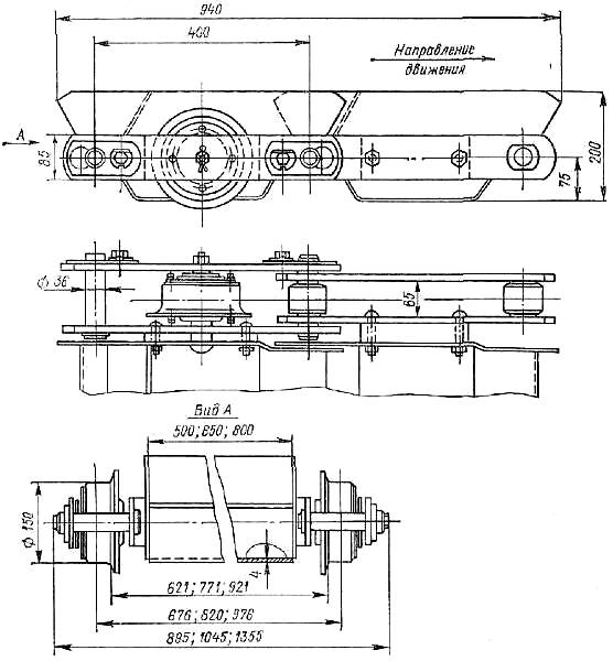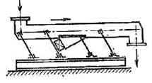 Безбортовой настил применяют для транспортированияштучных грузов. Чтобы предохранить груз от выпадения, иногда, особенно на участке загрузки, устанавливают вдоль настила неподвижные борта из досок или стальных полос. При неподвижных бортах безбортовые плоский сомкнутый и волнистый настилы применяют для насыпных грузов, бортовые плоский и волнистый настилы — для насыпных и штучных грузов (например, для горячего литья), а бортовые коробчатые настилы — исключительно для насыпных грузов при больших углах наклона (до 45 — 60°) и высокой производительности. Пластины настила крепят на болтах, заклепках или приваривают к специальным уголкам, прикрепляемым к пластинам тяговых цепей. Тяговые цепи соединяют друг с другом жесткими пластинами настила или сквозными осями, которые располагают через один, три шага цепи. Направление движения настила должно строго соответствовать стрелкам, указанным на рис. 13; в противном случае возможно попадание груза между пластинами настила и его повреждение.