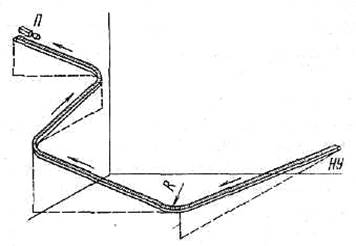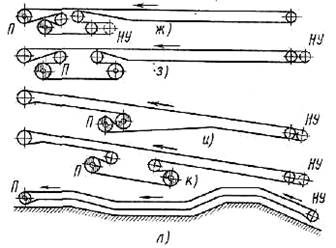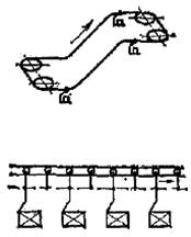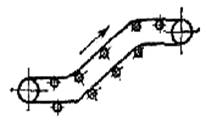 Изгибающиеся пластинчатые конвейеры могут перемещать насыпные и штучные грузы по трассе с перегибами настила как в вертикальной, так и в горизонтальной плоскостях (рис. 24). Это свойство конвейера достигается применением специальной цепи и настила, обеспечивающих пространственную гибкость. Изгибающиеся пластинчатые конвейеры применяют в угледобывающей промышленности для транспортирования угля в криволинейных выработках, а также в других отраслях для перемещения самых различных насыпных и штучных грузов, в том числе для транспортирования багажа в современных аэропортах. Основное преимущество пространственных конвейеров — обеспечение бесперегрузочного транспортирования грузов по сложной пространственной трассе одним конвейером вместо нескольких прямолинейных конвейеров с перегрузками груза. Их недостаток — сложность конструкции и эксплуатации. Однако, несмотря на это, изгибающиеся конвейеры получили распространение в СССР, ФРГ и Англии.