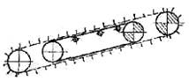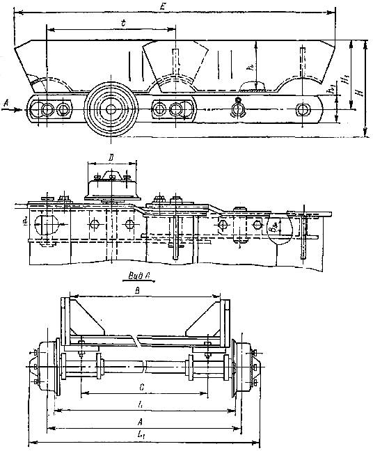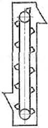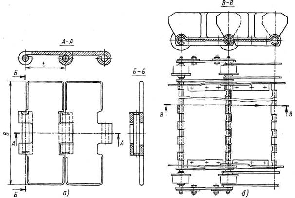 Тяговым элементом изгибающихся конвейеров служат одна или две специальные пластинчатые или кругло-звенные (с длинными звеньями) и двух-шарнирные цепи.