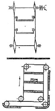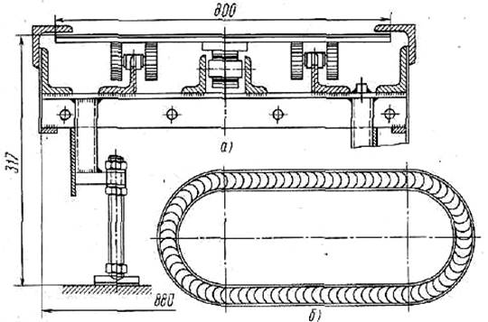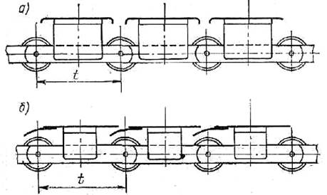 Рис 21. Ходовая часть конвейера с плоским петлевым настилом с грузонесущим и тяговым элементами : а— совмещенными; 6 — разделенными[1, 171 ст.]