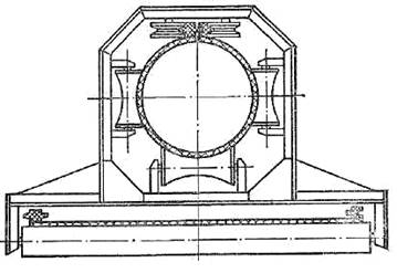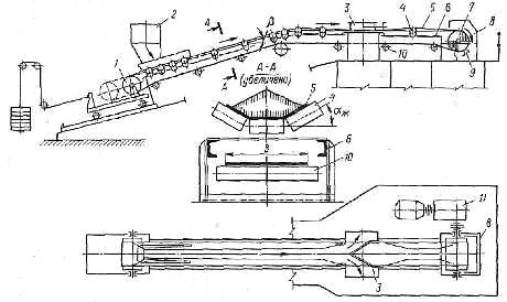 Ленточный конвейер (рис. 4) имеет станину 6 , на концах которой установлены два барабана: передний 7 — приводной и задний 1 — натяжной. Вертикально замкнутая лента 5 огибает эти концевые барабаны и по всей длине поддерживается опорными роликами, называемыми роликоопорами, — верхними 4 и нижними 10, укрепленными на станине 6. Иногда вместо роликов применяют настил. Приводной барабан 7 получает вращение от привода 11 и приводит в движение ленту вдоль трассы конвейера.
