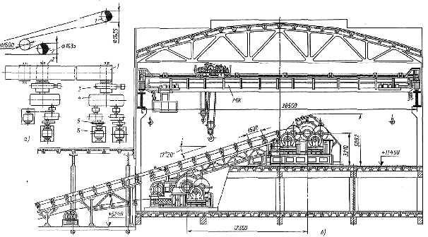 Рис. 5 Головная часть мощного ленточного конвейера с лентой шириной 2000 мм, производительностью 6000 т/ч для транспортирования железной руды: а — схема; б — конструкция; 1, 2 — приводные барабаны; 3 — муфта с остановом; 4 — редуктор; 5 — тормоз с муфтой; 6 — электродвигатель мощностью 1250 кВт; МК — мостовой кран для монтажа и ремонта привода