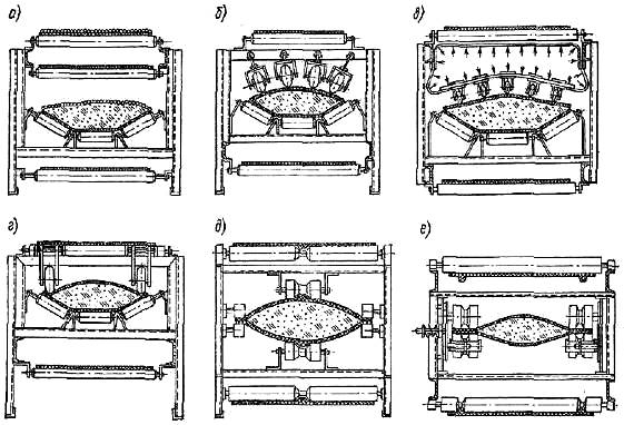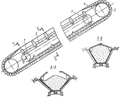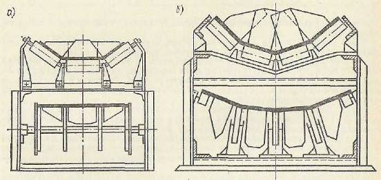 Для насыпных грузов при коробчатом настиле β = 45 ÷ 60°, однако при больших углах наклона (более 35°) производительность конвейера заметно снижается, поскольку груз надежно удерживается только в пределах высоты упорной стенки настила (см. рис. 13, ж и з).