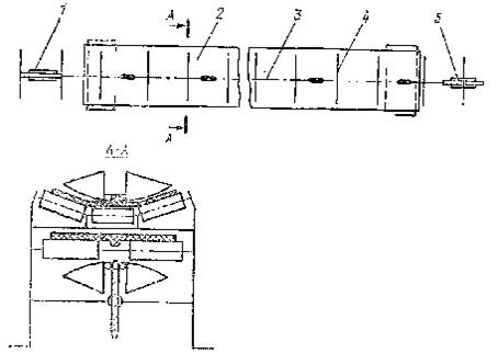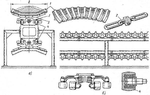 Рис. 25. Пространственный пластинчатый конвейер конструкции Штюббе (ФРГ): а — поперечное сечение; б — секция и узлы; 1 — настил; 2 — цепь с соединительным звеном; 3 — опорное устройство; 4 — каток