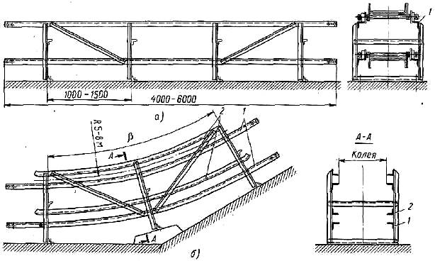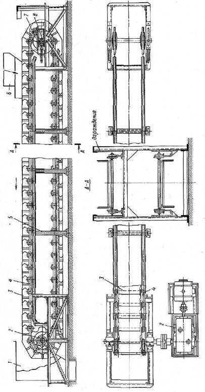 Станину конвейера, как правило, изготовляют из угловой или швеллерной стали (рис. 23). Концевые части выполняют в виде отдельных рам для привода и натяжного устройства, а среднюю часть (рис. 23 а) для опоры настила — в виде отдельных секций металлоконструкции длиной по 4 — 6 м. В качестве опорных (направляющих) путей для ходовых катков цепей служат уголки 1 для конвейеров легкого типа и швеллеры или узкоколейные рельсы — для конвейеров тяжелого типа. На криволинейных секциях (рис. 23,6) над путевыми профилями устанавливают контршины 2. На конвейерах поточной линии у станины средней части и цепи рабочей ветви размещают предохранительные ограждения и сиденья для рабочих. [1, 173 ст.]