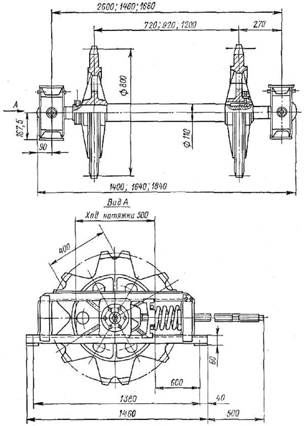 Натяжное устройство конвейеров — винтовое или пружинно-винтовое, устанавливается на концевых звездочках (рис. 22). Ход натяжного устройства X = 320 ÷ 1000 мм принимается в зависимости от шага тяговой цепи (обычноне менее 1,6 — 2 шага). Одну из звездочек натяжного устройства закрепляют на валу на шпонке, а другую — свободно для возможности самоустановки по положению шарниров цепи.