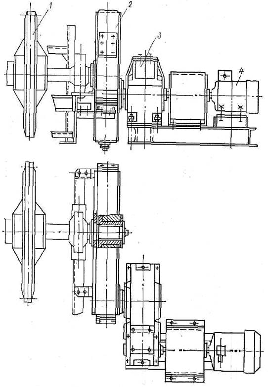 Передаточным механизмом привода является один редуктор или редуктор с дополнительной зубчатой или цепной передачей. При необходимости плавного регулирования скорости в передаточный механизм между электродвигателем и редуктором устанавливают вариатор скорости. Известно применение гусеничных приводов с электромагнитным захватом звеньев цепи конвейера. Для этого на приводной гусеничной цепи укрепляют электромагниты, которые обесточиваются при подходе к приводной звездочке.