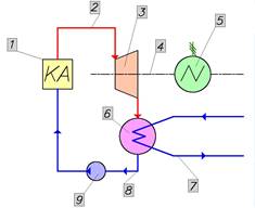 На рис.1. представлена принципиальная схема работы КЭС. Свежий (острый) пар из котельного агрегата (1) по паропроводу (2) попадает на рабочие лопатки паровой турбины (3). При расширении, кинетическая энергия пара превращается в механическую энергию вращения ротора турбины, который расположен на одном валу (4) с электрическим генератором (5). Отработанный пар из турбины направляется в конденсатор (6), в котором, охладившись до состояния воды путём теплообмена с циркуляционной водой (7) пруда-охладителя, градирни или водохранилища по трубопроводу (8) направляется обратно в котельный агрегат при помощи насоса (9). Бо́льшая часть полученной энергии используется для генерации электрического тока.