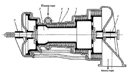 Поток водяного пара поступает через направляющие аппараты на криволинейные лопатки, закрепленные по окружности ротора, и, воздействуя на них, приводит ротор во вращение.