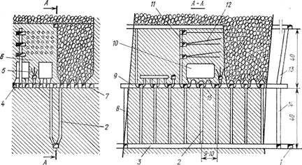 Подготовка блоков как при этом, так и при других приведенных выше вариантах этой системы практически одинакова. Она включает проходку полевого откаточного штрека 1 и ортов 3. Из откаточных ортов до отметки первого подэтажа проходят рудоспуски 2, ходовые 8 и материальные 14 восстающие. На каждом подэтаже проходят хозяйственные орты 9 и штреки скреперования 7. На границах блока штреки скреперования соединяют вентиляционными ортами 4, из которых в лежачем боку проходят запасной ходовой восстающий 13.