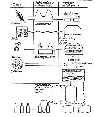 В основе производства большинства спиртных напитков, например пива, сидра, виски, джина лежит процесс ферментации (брожения) дрожжей. На рис. 5, например, приведена схема приготовления пива.