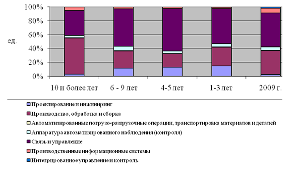 За анализируемый период патенты на изобретения использовались только при внедрении производственных технологий, связанных с производством, обработкой и сборкой (90, 1% от общего количества патентов на изобретения в используемых технологиях), аппаратуры автоматизированного наблюдения и контроля (6, 1%), проектирование и инжиниринг (3, 8%).