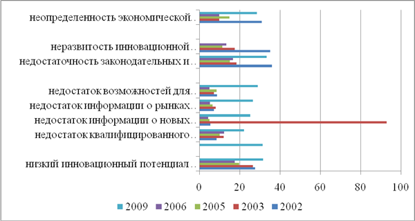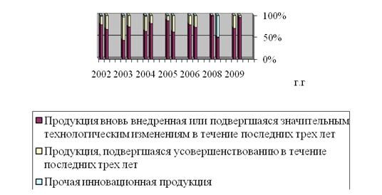 В 2009 году продолжала наблюдаться тенденция снижения количества промышленных организаций, имевших инновации. Например, продуктовые инновации имело промышленных организаций на 11, 19% меньше, чем в 2002 г., процессные инновации – на 6, 9%, а и те, и другие – на 50%. При этом затраты промышленных предприятий на эти инновации возрастают. Однако часть эффективных и прогрессивных научно-технических разработок остается невостребованной, т.к. предприятия не в состоянии финансировать их промышленное освоение. Это связано с недостатком финансовых средств у предприятий.